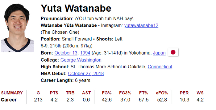渡边雄太更是前NBA球员,他在NBA打了213场比赛,场均4.2分2.3篮板0.6助攻,命中率42.6%,三分命中率37%,他在NBA只是一个轮换而已。